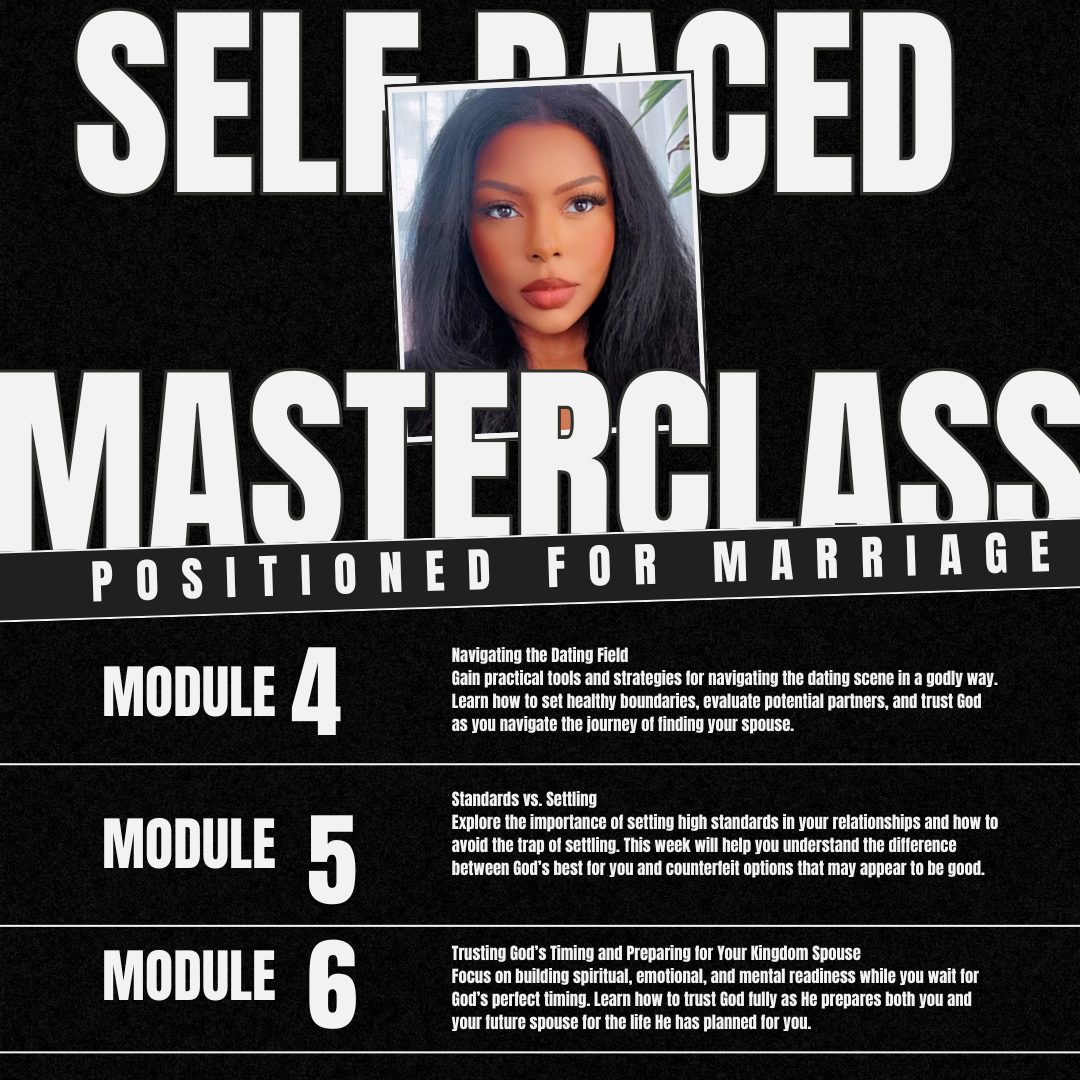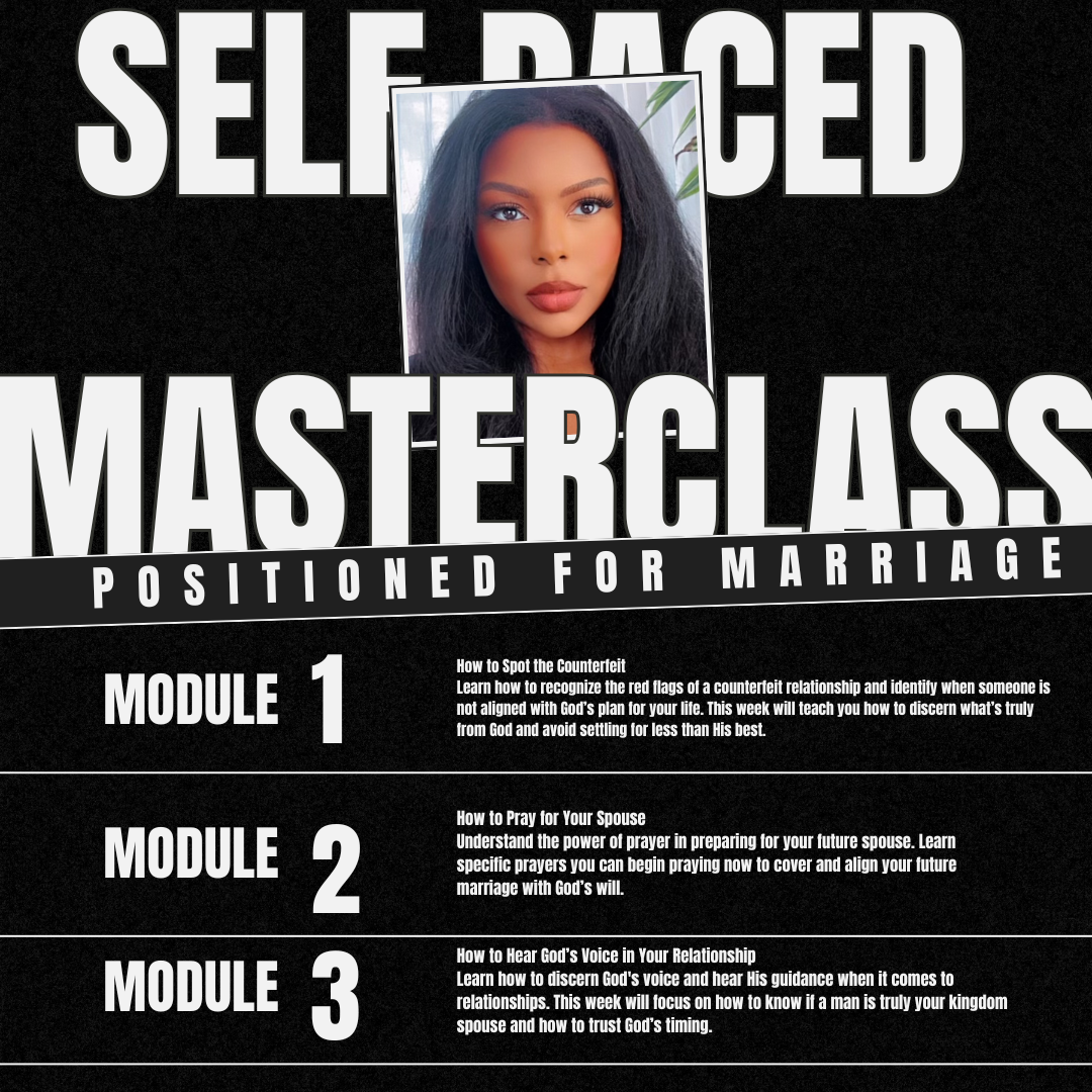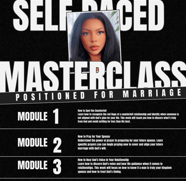 Are you tired of wondering when your kingdom spouse will show up? It's time to stop waiting and start preparing. Positioned for Marriage is a transformative, self-paced program designed to help you align your heart, mind, and spirit for the God-ordained relationship He has planned for you. Take control of your preparation and begin the journey today